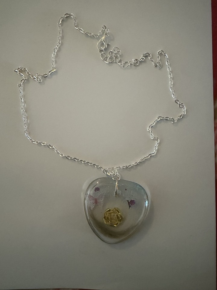 Création d’un pendentif en forme de cœur, avec poil de chien, paillettes papillon, fleurs couleur or et lettres